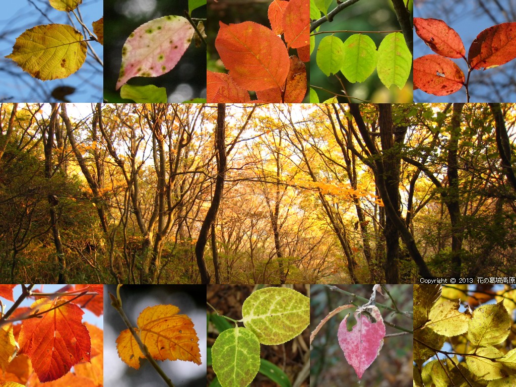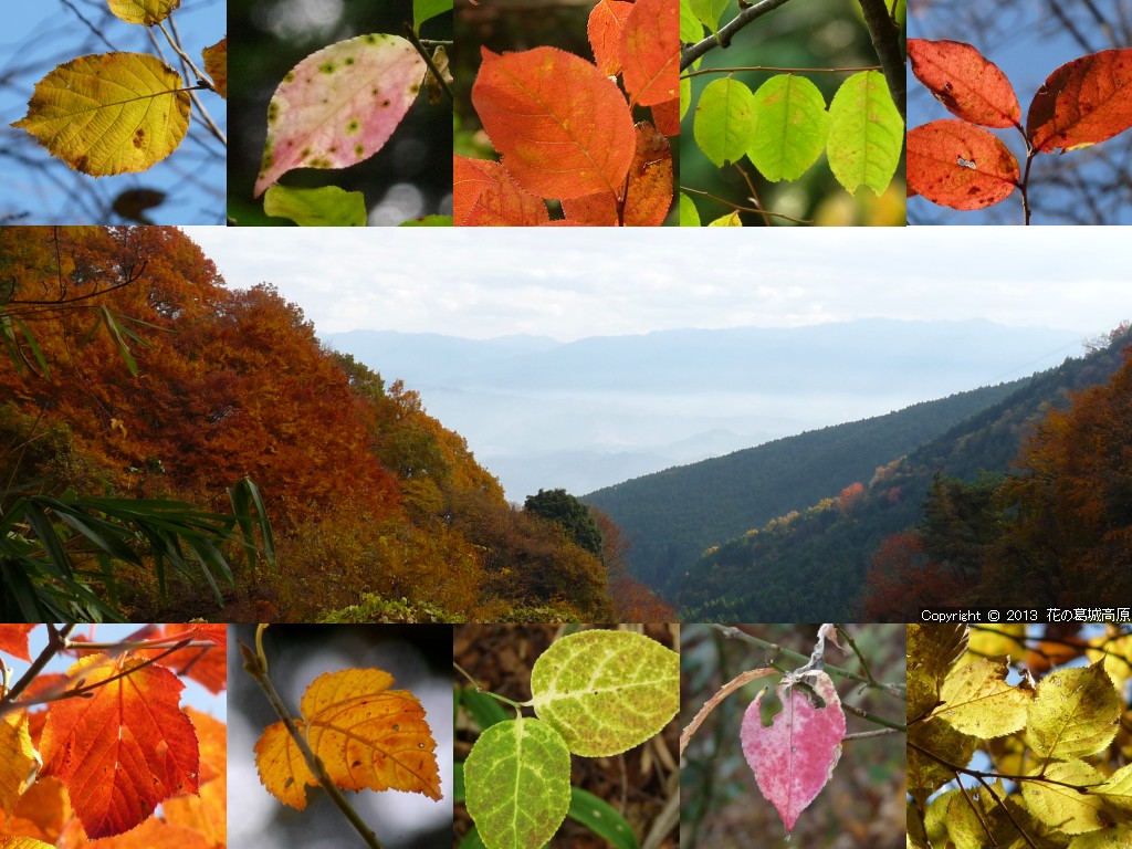 2013年 秋の壁紙の背景写真の解説 ◎左側より「北尾根からの秋津洲」「遊歩道より西自然研究路」「遊歩道より東自然研究路」「水越峠へと下るダイトレの夕暮れ」