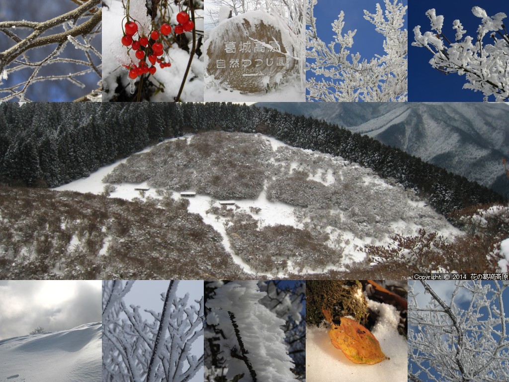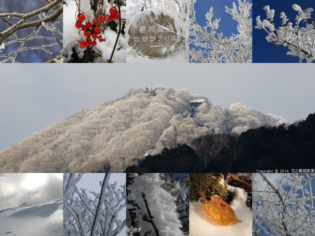 2014年 冬の壁紙の背景写真の解説 ◎左側より「山頂尾根の霧氷の遊歩道」「雪の晴れ間・自然つつじ園」「山麓から山頂駅付近の霧氷を見る」「高原ロッジ前」
