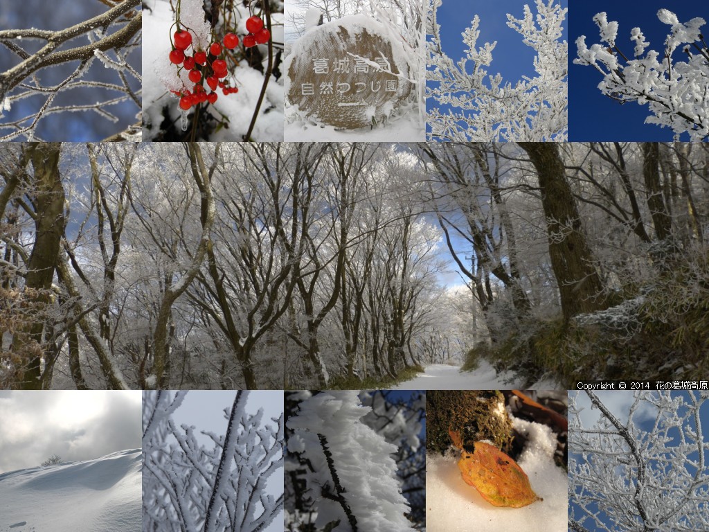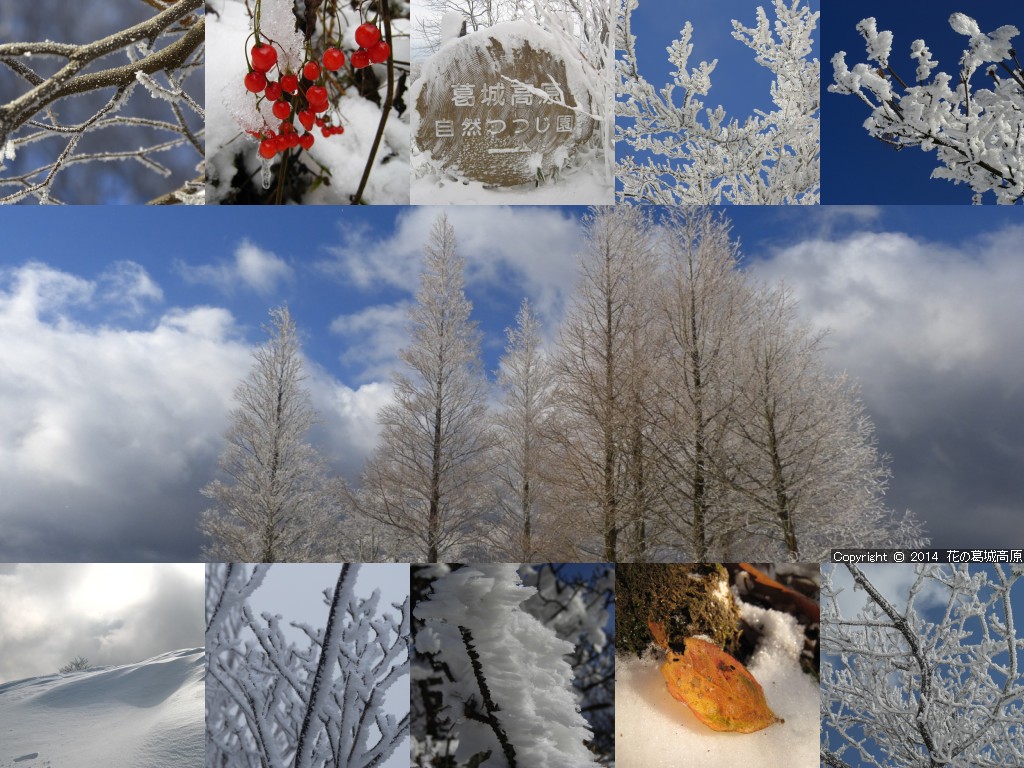 2014年 冬の壁紙の背景写真の解説 ◎左側より「山頂尾根の霧氷の遊歩道」「雪の晴れ間・自然つつじ園」「山麓から山頂駅付近の霧氷を見る」「高原ロッジ前」