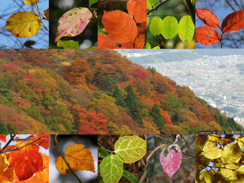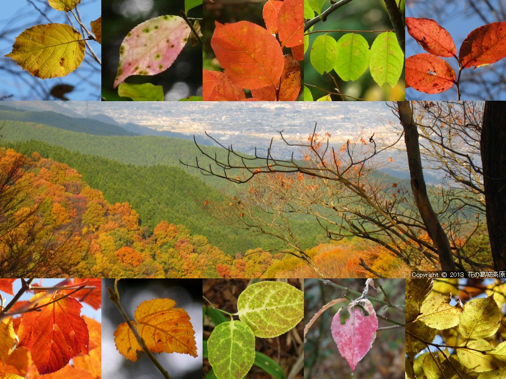 2013年 秋の壁紙の背景写真の解説 ◎左側より「北尾根からの秋津洲」「遊歩道より西自然研究路」「遊歩道より東自然研究路」「水越峠へと下るダイトレの夕暮れ」